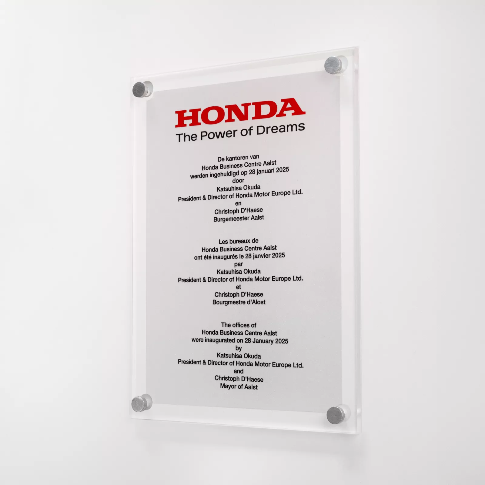 Een inhuldiging, opening of eerstesteenlegging verdient een blijvende herinnering. Met een stijlvolle inhuldigingsplaat maakt u van dit unieke moment een tastbaar symbool van trots en erkenning. Een inhuldigingsplaat is méér dan een naamplaatje – het is een blikvanger die uw gebouw, project of organisatie op een representatieve manier presenteert. Het markeert een mijlpaal in de tijd en vertelt een verhaal dat blijft. Onze inhuldigingsplaten zijn beschikbaar in hoogwaardige materialen zoals inox, koper, aluminium of plexiglas, en worden volledig op maat gemaakt. Typische elementen zoals de datum van inhuldiging, de namen van betrokken personen of de gelegenheid zelf kunnen subtiel of opvallend gegraveerd worden, afhankelijk van uw voorkeur. Kies voor een duurzame, elegante en professionele afwerking die perfect aansluit bij de uitstraling van uw project.